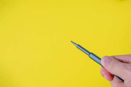 a man's hand holds a small screwdriver with a torx nozzle on a bright yellow background. Copy space, space for text