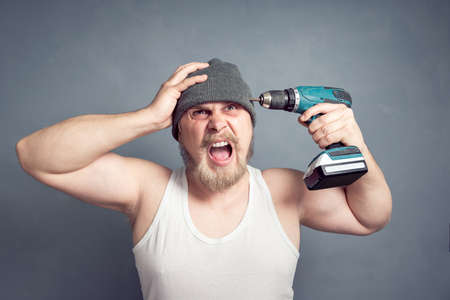 A guy with a creepy expression is holding a drill near his head. The concept of headache, abstract drilling of the brain, noisy repair work.