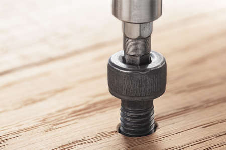 hex bolt screw hex bit in wooden oaks plate. Spanner, bolt, screw and nuts.