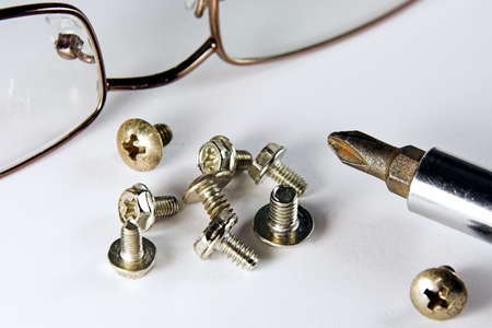 Macro of computer crews, screwdriver and eye-glasses