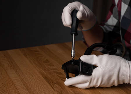 Fixing with screw driver. Screwdriver tool in hands in gloves.