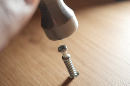 Hammer striking metal screw on wooden surface