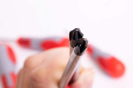 Screwdrivers in hand on a white background close up