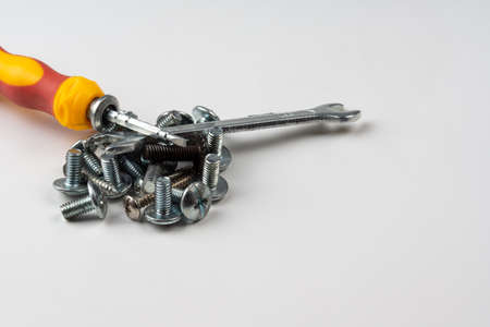 Screwdrivers and screws on a white background. The concept of work. Labor day.