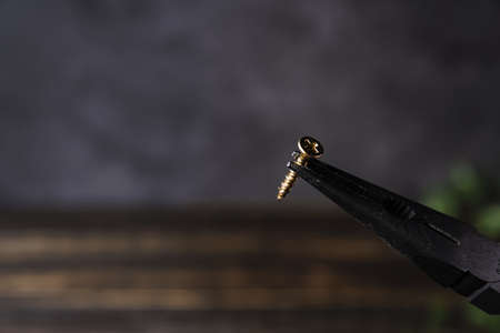 Self-cutters and screwdriver on a gray background with space for text. Screw with thread - fasteners for construction, tools and accessories for repair