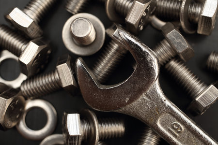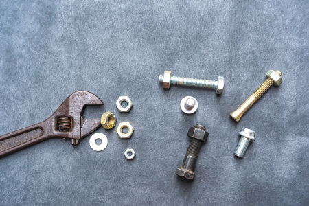 Bolt nuts and wrench on cement floor in darkness. Closeup and copy space for text. Concept of mechanical engineering jobs.
