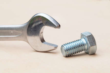 Wrench, hex bolt and hex nut on leather floor.