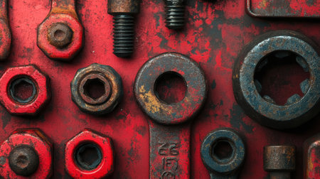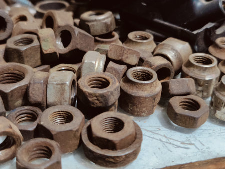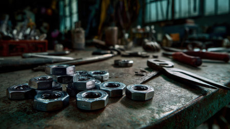 A detailed close-up of metal nuts scattered on an old workbench with tools, showcasing an industrial environment rich in texture and character. Perfect for workshop themes.