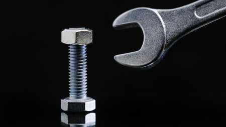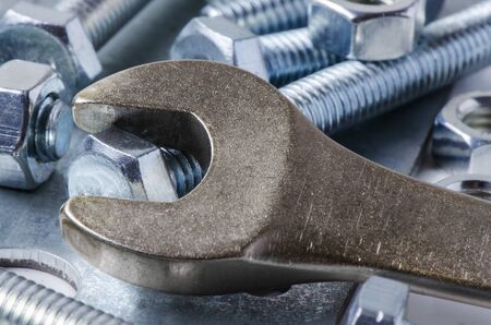 Metal bolts and nuts. Tools for working and fixing. Macrophotography