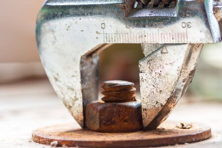 Old rusty screw thread being adjusted on a metal surface, concept image for manual labor, industry and construction