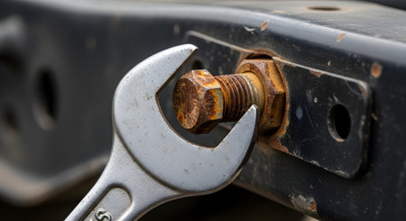 A close-up shot shows a metal wrench gripping a large, hexagonal bolt and nut. The bolt and the surrounding metal bracket are covered in significant rust and corrosion, illustrating a concept of repair, maintenance, or stuck hardware.