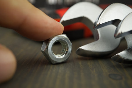 Finger holds the single metal nut next to set of spanners or wrenches