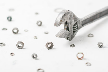 Wrench on a light stone background. Nuts and washers of different sizes.