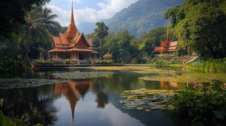 A stunning traditional Thai pavilion adorned with intricate wooden details stands gracefully amidst a vibrant garden filled with colorful bougainvillea flowers, symbolizing serenity and cultural richness.