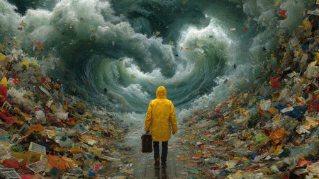 Man in yellow raincoat surrounded by ocean of garbage in swirling waves.