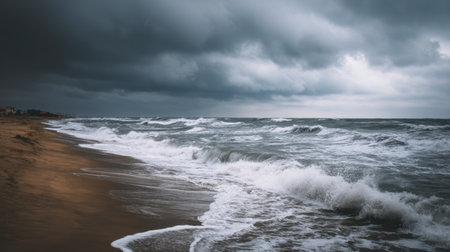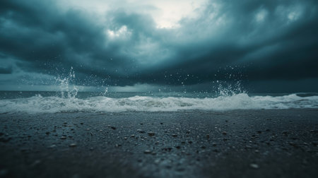 A dramatic seascape showcasing choppy ocean waves beneath dark, heavy clouds. The peaceful beach setting evokes emotion, capturing nature's beauty.