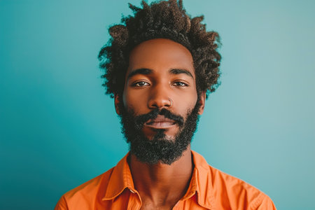 Happy African American Man with Beard Wearing Blue Shirt on Turquoise Background Smiling Happily