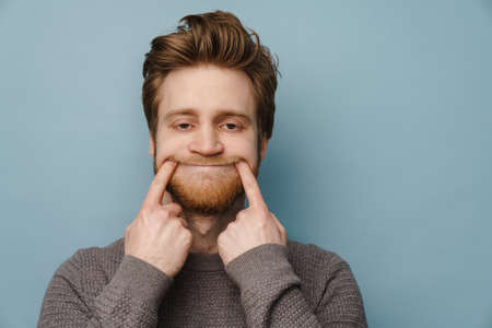 White ginger man with beard smiling and looking at camera isolated over blue background