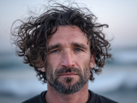 Disheveled curly-haired man with a serious expression looking directly at the camera. He has a beard and wears a plain dark shirt. Background is soft-focus and neutral