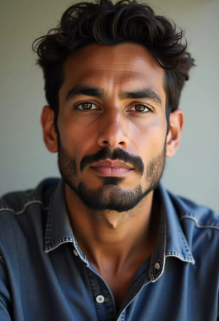 A Brazilian man gazes directly at the viewer, displaying a calm demeanor and confident expression.