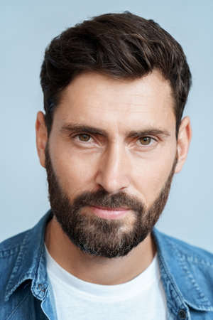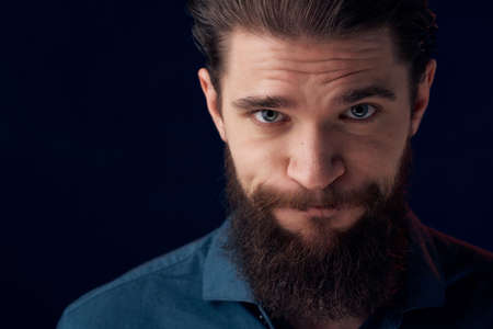 Closeup face portrait of bearded man isolated on blue studio background