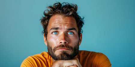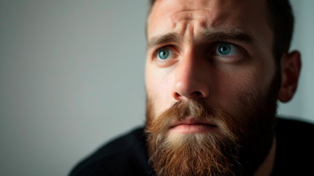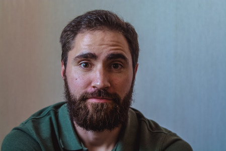 Young bearded man staring at camera with furrowed brow, puzzled and worried expression conveying stress, doubt, and contemplation