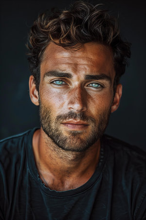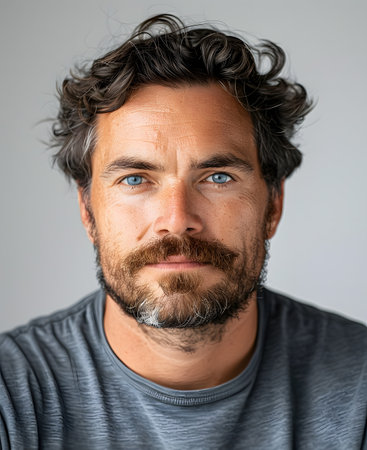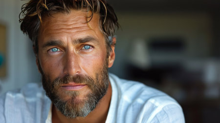 Portrait of a confident man with a beard and piercing blue eyes looking directly at the camera