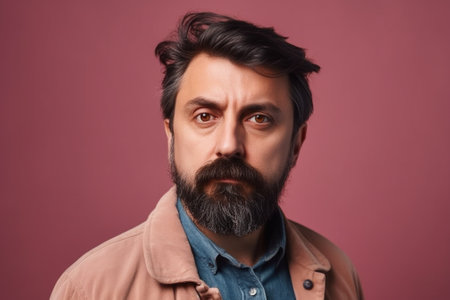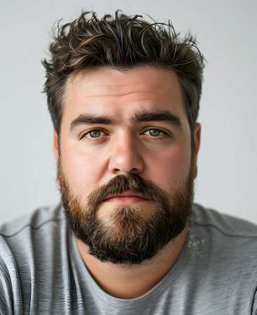 Portrait of a very serious, somber or depressed dark hair and beard middle-age man over grey bacground.