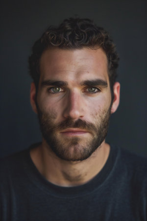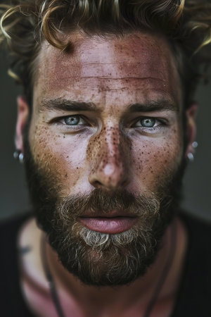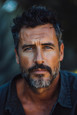Close-up portrait of a man with a beard and intense gaze