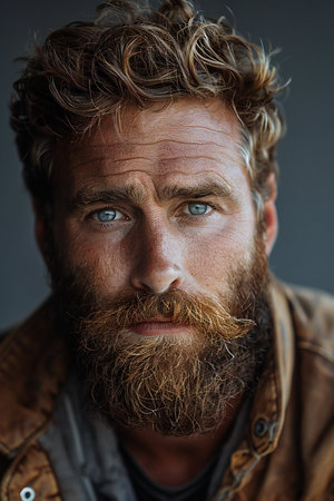 Portrait of a bearded man with blue eyes on a gray background