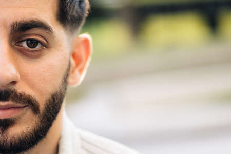 Half face portrait of young man with beard. Half face of upset bearded caucasian young man looking straight to camera while standing outdoors in empty town