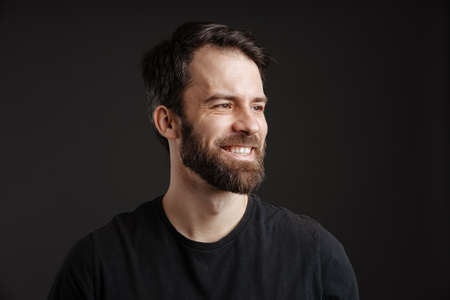 Bearded brunette white man smiling and looking aside isolated over black background