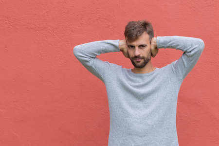 Portrait of young man covering both ears with hands on red background. Suffering from loud sound.