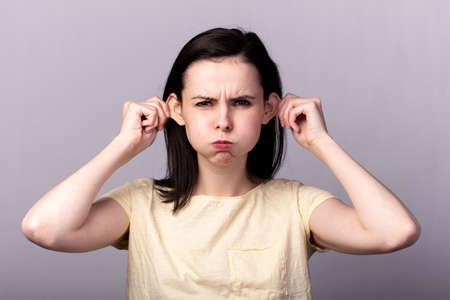 Girl in her mid 20's covering ears, suffering from loud noise, unhappy female feeling pain