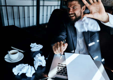 Business man in a cafe sitting at the table documents laptop crumpled paper executive lifestyle emotions