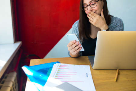 Female in glasses confident business worker reading pleasant text message on cellphone while sitting at desktop with open laptop computer and paper documents