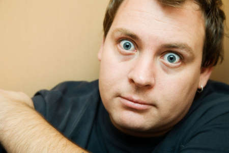 A young man with tousled brown hair and striking blue eyes gazes directly at the camera, his expression a mix of surprise and curiosity. The soft, neutral background enhances his expressive features, creating an intimate and engaging portrait that captures a moment of genuine emotion.
