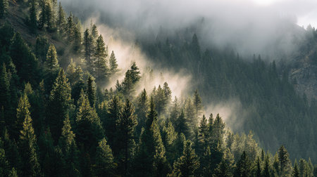 An atmospheric landscape features tall evergreen trees shrouded in thick fog. The scene is dominated by shades of green and gray, with soft lighting and a blurred background. Suitable for a variety of uses including environmental, travel, and natural beauty themes.