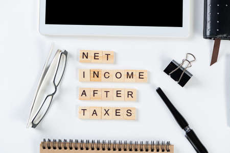 Net income after taxes concept with letters on cubes. Still life of office workplace with supplies. Flat lay white surface with tablet computer, pen and glasses. Financial management and taxation.