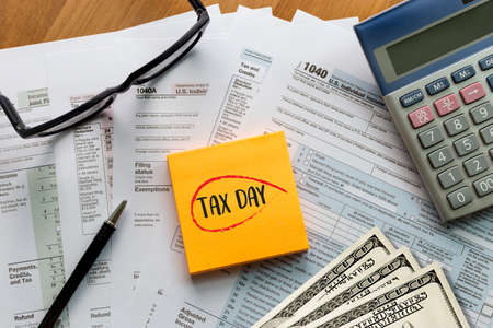 Tax concept. Need help wtite on sticker, coin us, calculator and 1040 american tax form.