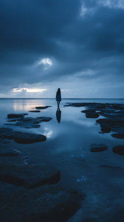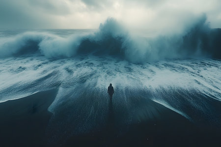A lone figure stands on a beach facing crashing waves under a cloudy sky, capturing the essence of solitude and nature's power. the dramatic ocean scene evokes feelings of reflection and resilience against the elements. Generative AI