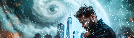 A vivid capture of a young man's moment of overwhelm, covering his face with his hands amidst the city lights