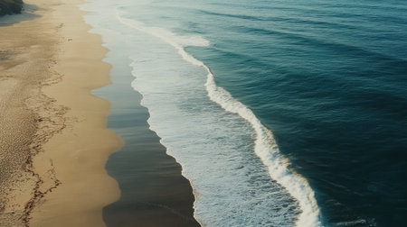 White sea foam creates soothing patterns as it washes onto the beach, offering a tranquil seaside view. Ai generated image