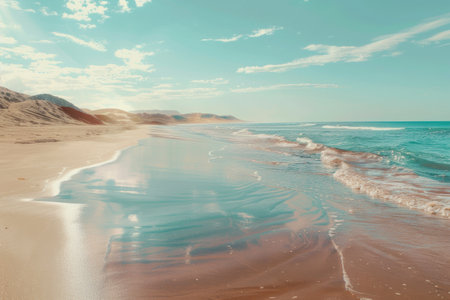 A tranquil scene of gentle waves lapping against a sandy beach, showcasing the natural beauty of the ocean and coastline under soft sunlight. Perfect for relaxation and vacation themes.