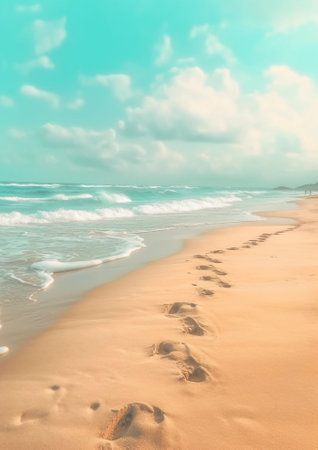 Foot steps on the sand beach Summertime concept Copy space : Generative AI