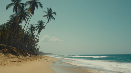 AI Generated. Serene tropical beach with turquoise waves and palm trees under a clear blue sky