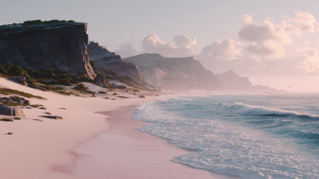 A breathtaking coastal view at sunrise, featuring gentle waves, pink sand, and stunning cliffs, offering a serene atmosphere perfect for nature lovers and travelers.