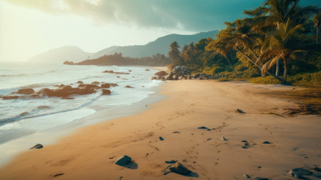 a vibrant green beach scene featuring white rocks and palm trees, bathed in golden light. this captivating photo captures the essence of afro-colombian themes, with a touch of sci-fi landscapes. shot with the sony fe 85mm f/1.4 gm lens, the image showcases a harmonious blend of light indigo and orange hues, creating an exotic and mesmerizing nature scene. ai generated