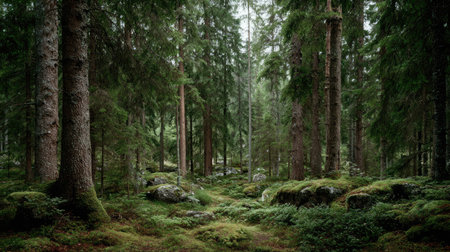 Escape into a serene forest landscape showcasing tall trees and vibrant green moss, creating an atmosphere of tranquility and natural beauty.