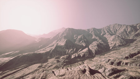 In the early hours of the day, a vast mountainous terrain emerges under gentle light. Peaks rise dramatically, creating a serene and breathtaking view of natures beauty.